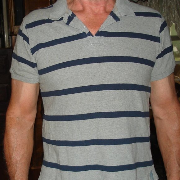 Basic Editions Classic Fit Mens Gray & Blue Striped Short Sleeve Polo Size LG