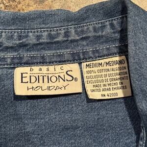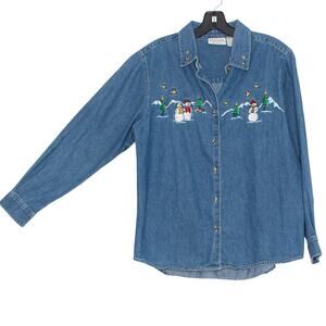 Basic Editions Holiday Top Denim Christmas Cottage Folk Granny Button Medium HG