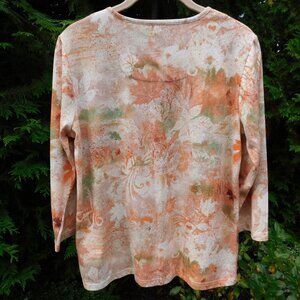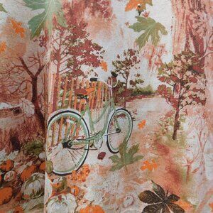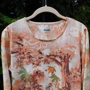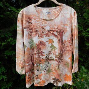 Basic Editions pretty orange/brown/cream/green 3/4-sleeve T-Shirt featuring Fall leaves, bicycle, pumpkins, and tiny rhinestones
