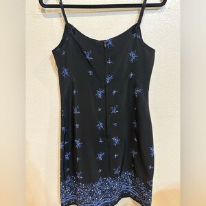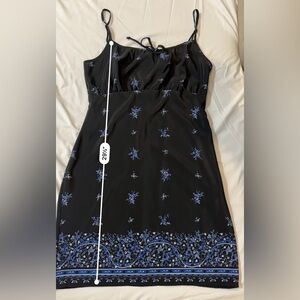 This stunning slip dress by Basic Editions is perfect for a cocktail night out. It features a sleeveless design with spaghetti straps and a flattering midi length. The black base is beautifully contrasted by blue patterns, adding a touch of elegance to its form-fitting silhouette. Adjustable Straps and a zip back. Size is a 9/10 I believe juniors, which will fit up to a size 6 in Women. No flaws.