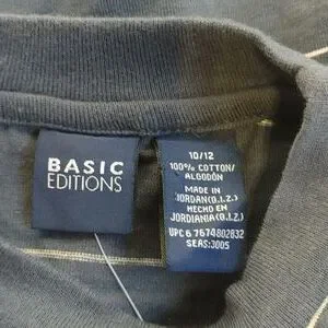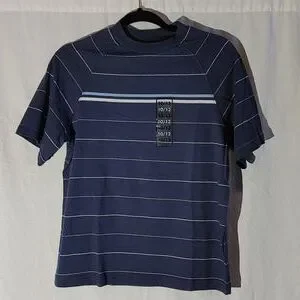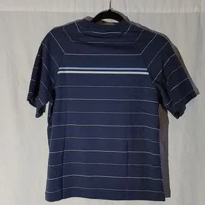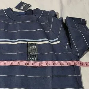 Approximately 23 3/4" total length, back neck to bottom excluding collar. Colors: blue with white stripes.