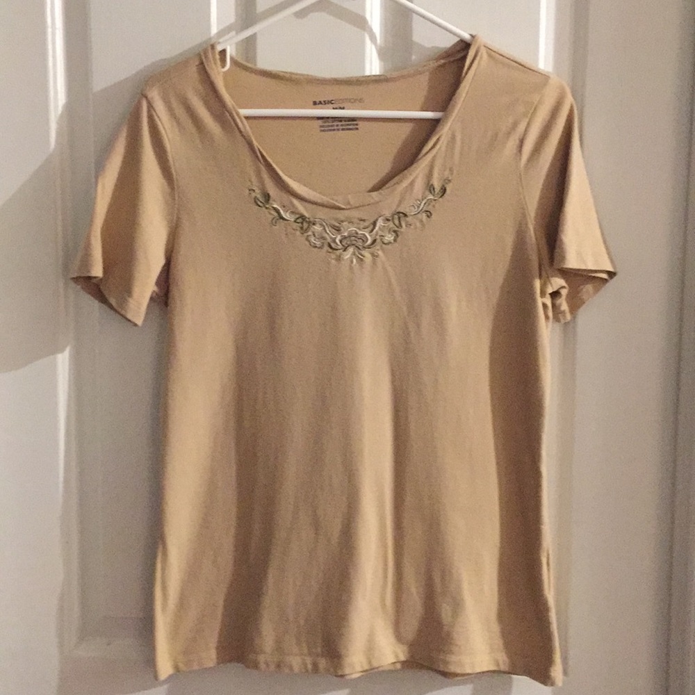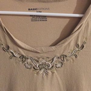 Tan top, by Basic Editions, size medium, nice twisted necklace & pretty embellishment, worn a few times, very good condition!