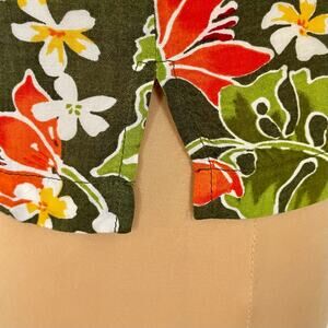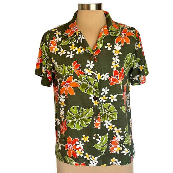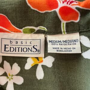 Basic Editions Tropical Button Up Shirt Womens Size M Short Sleeve Resort Summer. Green with bright tropical floral print. 100% Rayon. In excellent preowned condition.