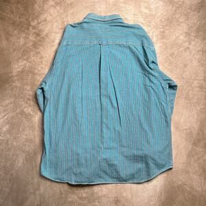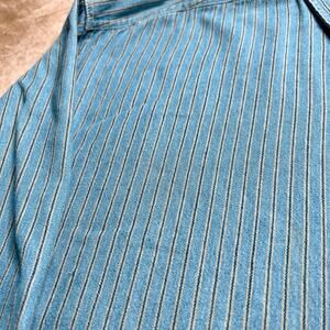 Long sleeve collared shirt with blue and tan vertical stripes. One front pocket. Button closure. Vintage 1990s.