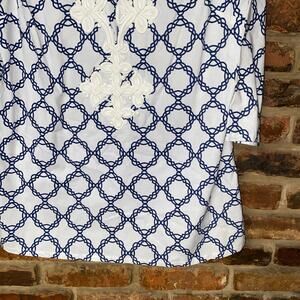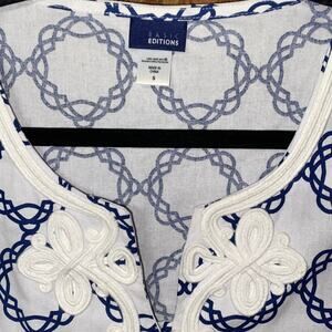 Basic Editions White Blue Embroidered Printed 3/4 Sleeve Tunic Top Women's Small