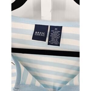 This Basic Editions women's T-shirt, in size 2X, features a classic blue and white striped pattern with a flattering V-neck design. The shirt is adorned with delicate embroidery, adding a touch of elegance to its casual style. Made from 100% cotton, it offers a soft, breathable feel for all-day comfort. Ideal for pairing with jeans or shorts, this T-shirt combines simplicity with a refined detail, making it a versatile piece for your everyday wardrobe.