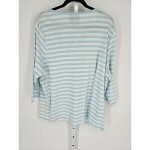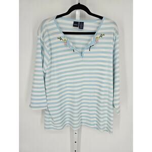 Basic Editions Women's Blue White Striped V-neck Embroidered T-shirt Top Size 2X