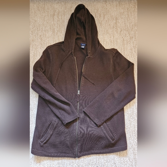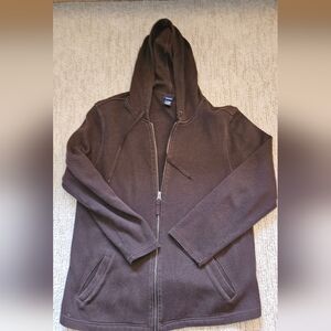 Comfortable zip-up sweater with hood. Ideal for layering.