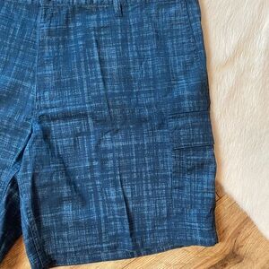 Basic Editions men's cargo shorts with a blue plaid pattern.