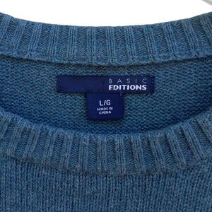 I good preowned condition. Awesome chunky sweater. Lighter and darker blue stripes. Measurements in photo (Photo reflection alters true look of color in this measurement photo).Measures: armpit to armpit 22 1/2", front top to bottom 24". From a smoke free and cat/dog friendly home. (#16)