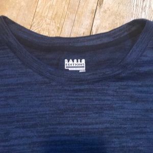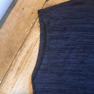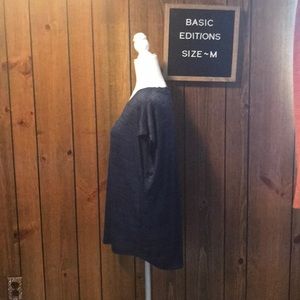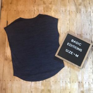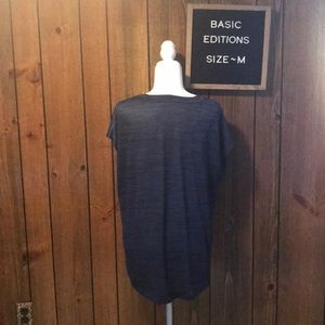 Beautiful navy and black heather top that can be worn casual or dresses up! Asymmetrical cut hanging lower in the back.