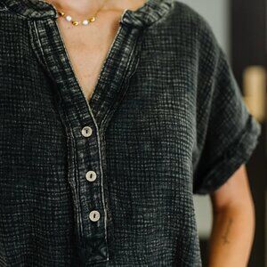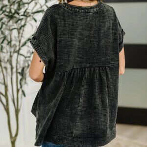 Basic Fade V-Neck Acid Wash Top in Black