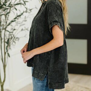 Our Basic Fade V-Neck Acid Wash Top is the perfect addition to your wardrobe. Made with lightweight gauze, it features a trendy v-neckline and functional 3/4 front button closures. The dolman sleeves and banded cuffs add a touch of flair, while the raw and exposed seams give it a unique edge. With a banded stepped hemline and side slit, this top is both stylish and comfortable.