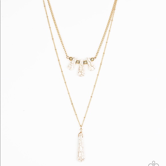 Chiseled into flared teardrop shapes, a dainty fringe of white stones and golden beads gives way to a large stone pendant, creating earthy layers down the chest.