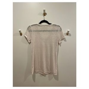 Tan short sleeved “V” neckline Tee shirt. Fitted style with hemmed bottom.