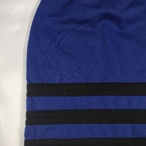 This is a blue and black bodycon striped mini skirt. It is a small size and in excellent condition. It is very lightly loved with no notable defects.