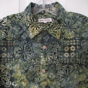 Basic Options Mens S/S Green Cotton Casual Hawaiian Shirt. Size Large. Armpit-to-armpit 24", Length 31.5". 100% Cotton in Green Abstract.