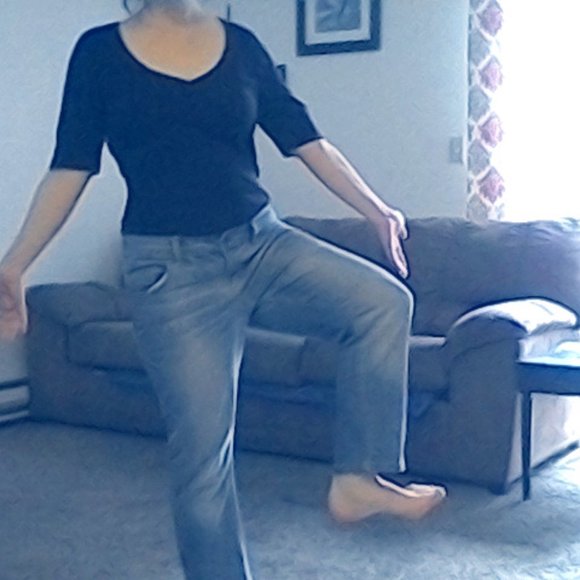 A black t-shirt with blue jeans.