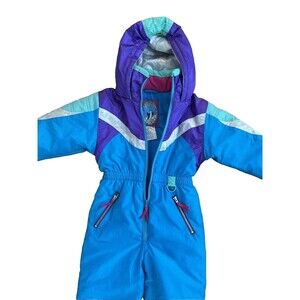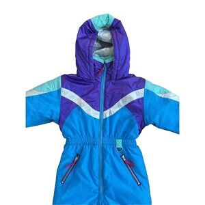 Super 90s Y2k Colorblock snowsuit ski suit design with the main color being blue. Bright colors! Long sleeve with hood.