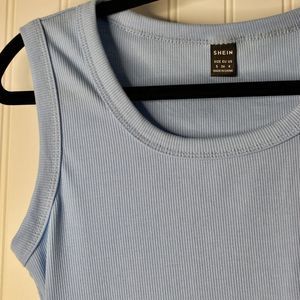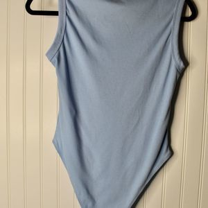 Baby Blue ribbed scoop neck body suit. Casual, medium height neck making it cute but still modest and wearable for all occasions. Snap closure at the bottom. NWOT never worn. Stock photo represents true color.