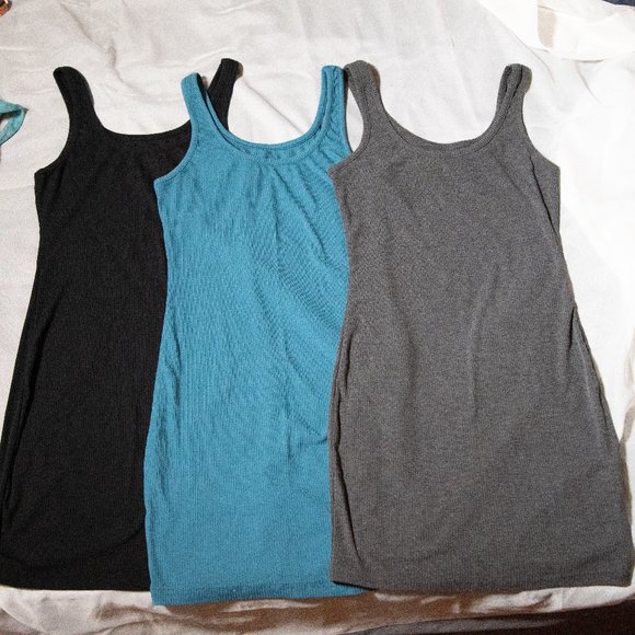 Three nearly new dresses. Basic bodycon fit, ribbed matieral. Stretchy and soft! Great base for any outfit or on their own!