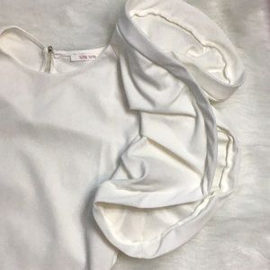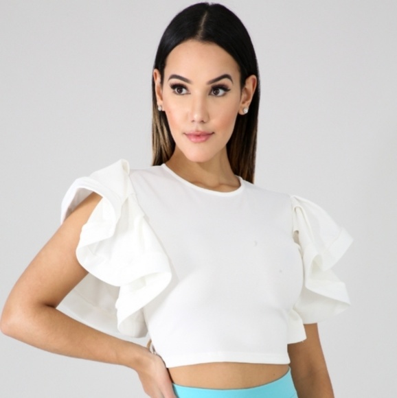 This Ruffled top features, a semi-stretch fabric, flare swirl on shoulders and round neckline.