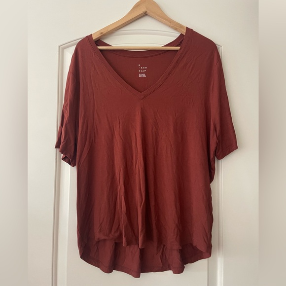 Super simple/basic piece! Such a soft jersey-cotton like material with a slight v-neck. Perfect fall color. Slight barely-noticeable stain on the front bottom - can be covered with a French Tuck, priced accordingly