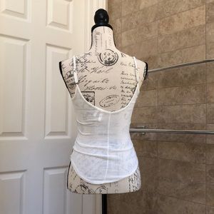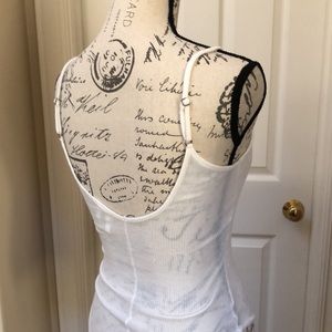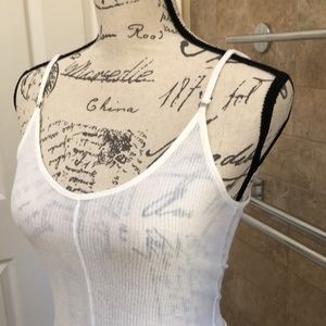 basic white tank top; thin ribbed material; adjustable straps; sheer