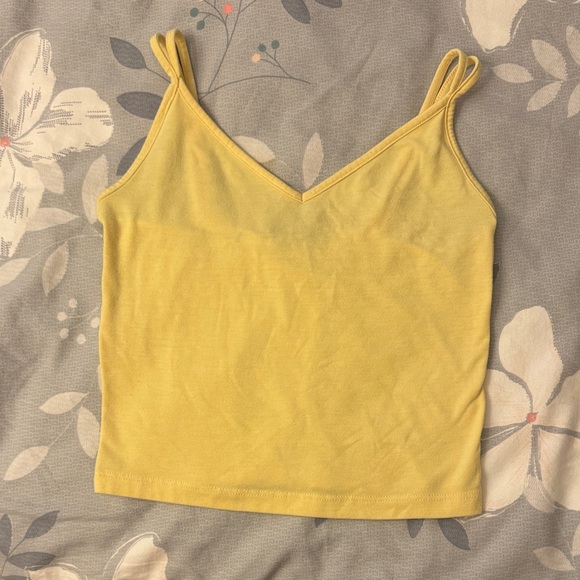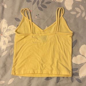 Chic yellow camisole with spaghetti straps. Ideal for layering or wearing alone.