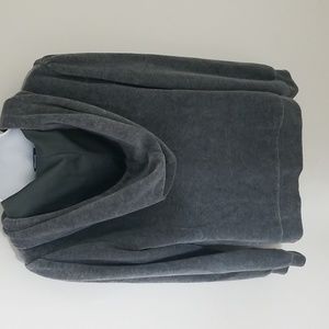 gray velvet jacket with a jewel on the zipper and bows on both pockets.