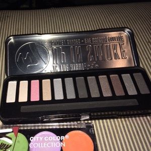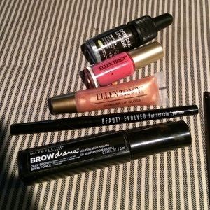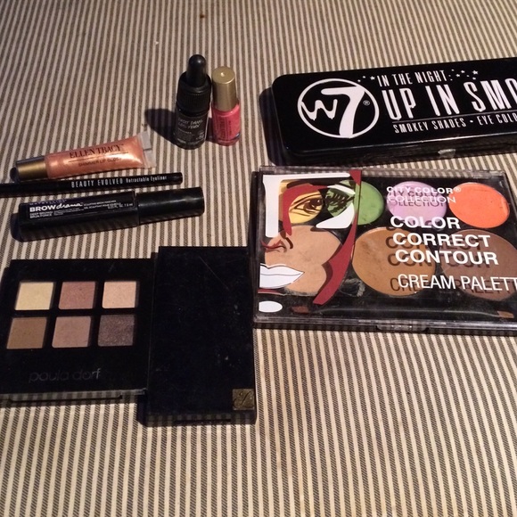 City color cream contour and blemish cover palette slightly used, in the night "up in smoke" smokey eyeshadow palette, Paula dorf eyeshadow pallet, Estee Lauder eyeshadow palette, maybelline drown drama (deep brown) slightly used, lush mascara (sorry it is in French I got it in Paris), Ellen Tracy cheek and lip stain, Ellen Tracy lip gloss, and beauty evolved black eyeliner