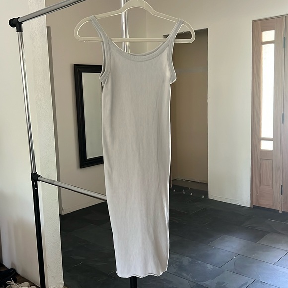 Bought years ago, I don’t even think I’ve ever worn it. Not sure if it’s a stain or somehow got dirty in the box it’s been sitting in but there’s a small spot shown in the picture. Nice ribbed stretchy material. Light purple/gray color.