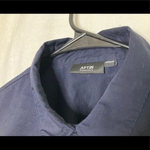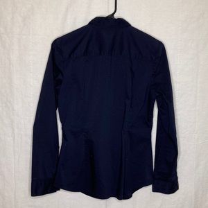 Light-weight fitted navy blouse. Material has some stretch and give to it. A shorter cut on both waist and arms. Great for a professional look while remaining cool and comfortable.
