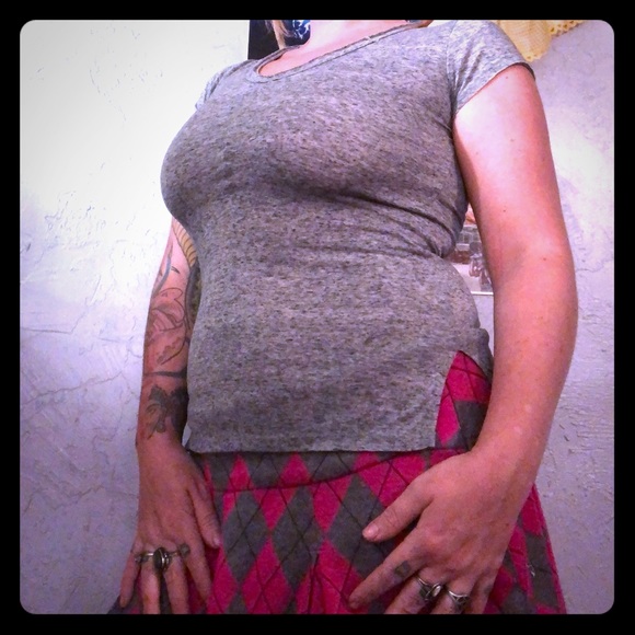 Basic grey tee, great for layering of worn alone. Anything is a potential belly shirt (to me 😝) and this is no exception! Size small but stretchy & accommodates abundant womanness ☺️ ( Skirt sold separately)