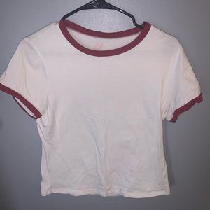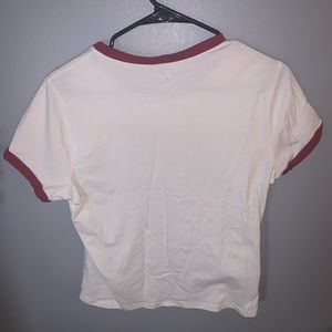 Regular white tee with a dark red lining on the sleeves, and neckline. Although the size is an L it really isn’t that big. No rips, tears, or stains. If you have any questions please let me know!