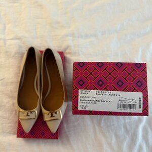 Dulce de leche colored pointy toe Tory Burch flats with gold hardware. Only worn twice but realized shoe size was too small for me. Comes with box and tissue paper. Love the style but looking to give them to a new home :)