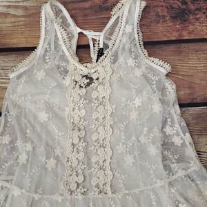 Sheer crocheted lace over lays a internal attached loose fit tank.