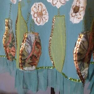 This is a beautiful aqua colored a-line skirt with flowers in vases embellished along the bottom and tulle lines out the bottom by Basil & Maude in women's size 6.