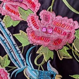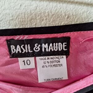 Basil and Maude Skirt. Inside lined in pink. Embroidered floral design with beaded detailing. Pink ribbon band around hem, with netting. Side zip closure. A line shape. Womens size 10 waist flat lay 17" length from waist to hem 27" measurements are approximate