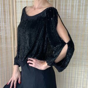 Basix 2 shine sequin 100% silk top- blouse in black, off-the-shoulder, size 14