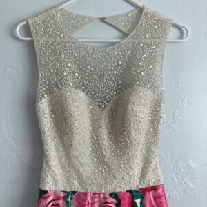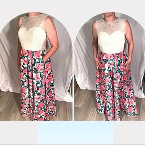 Basix Black Label Rose prom gown beaded illusion top w cut out back floral sz 2