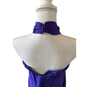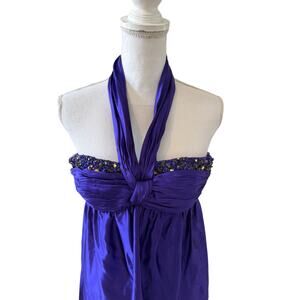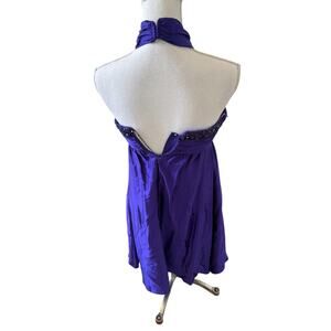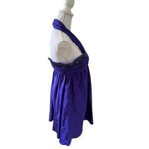 Basix Black Label Silk Empire Waist Babydoll Party Dress Royal Purple, size 4. Good preowned condition, 100% silk with sewn in cups, jeweled detail, halter neck strap (not one hook & eye is missing. Zippered back with sewn in bra cups.