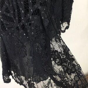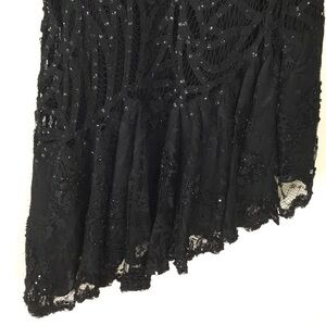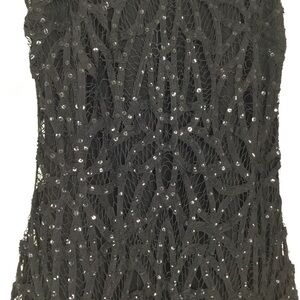 A gorgeous tank top dress with an uneven cut bottom. A black dress with a sequin netting overlay. No zipper and very little stretch.
