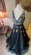 This elegant dress features a flattering V-neckline, a fitted bodice accentuated by a sleek black satin belt, and a flowing A-line skirt that creates a graceful silhouette. The bodice and skirt are adorned with delicate floral embroidery in shades of pink, yellow, blue, and green, adding a touch of whimsy and romance. The dress is fully lined with a light blue fabric for comfort and opacity. A perfect choice for a formal occasion, a wedding, or a glamorous evening out.