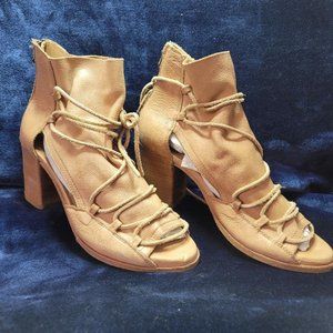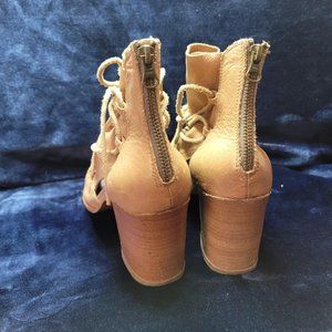 Baske California Open-toe leather chunky heels. Soft leather lace-up, zip back. Worn only a few times.(They are odd shaped, only because I stuffed the shoe with tissue paper for photo) Defect on inside as shown in photo. Size 9.5. Imprinted on sole with "Live in the Moment".