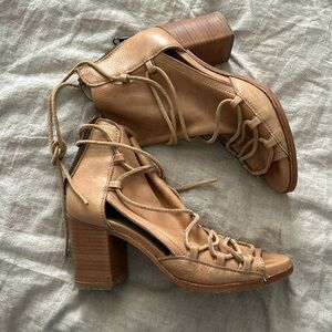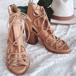 •strappy ankle tie/ back zipper/ open toe/ soft leather/ 3” height