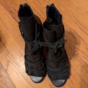 Super gorgeous butter soft black leather wrap around the caged front with zip back. Upper is in excellent condition. Extremely sexy goth Vogue appeal. Bottom sole shows wear but still very much a statement with the condition of the show body. Comfy and sexy. 3.25 heel height with app 4.5 inch shaft from heel to ankle.