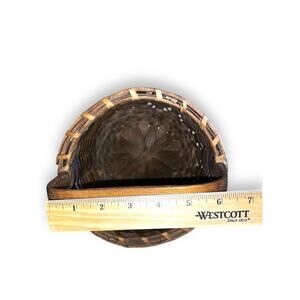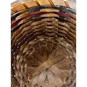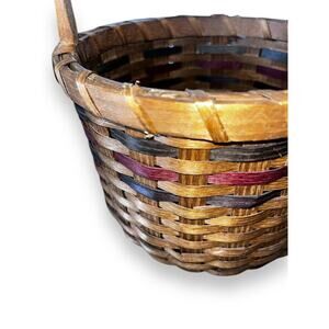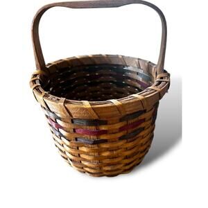 This is a vintage Basketville Putney Vermont handled basket in green and maroon. It is a round-shaped wooden basket with a weave pattern, ideal for casual use indoors or outdoors. Handmade in the United States, it features a shaker style design, making it a unique and original piece. It is medium-sized, unboxed, and comes with a handle for easy carrying.