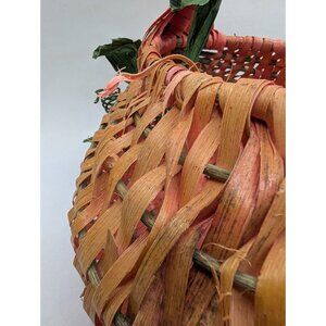 Basket Buttocks lightweight colorful woven w/ faux leaf vine Primitive Farmhouse. Unsure what material is for cover on vine and leaf.Measures approximately almost 8.5" tall by 7" by 10.5". Pre owned in good condition with some minor wear to finish including a piece of reed/wood? piece undone as shown in close up. For more details please study all pictures