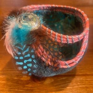 Gourd with Raku finish, coiled with painted Danish cord, inside is decoupaged fabric and adorned with feathers, beads and conch.